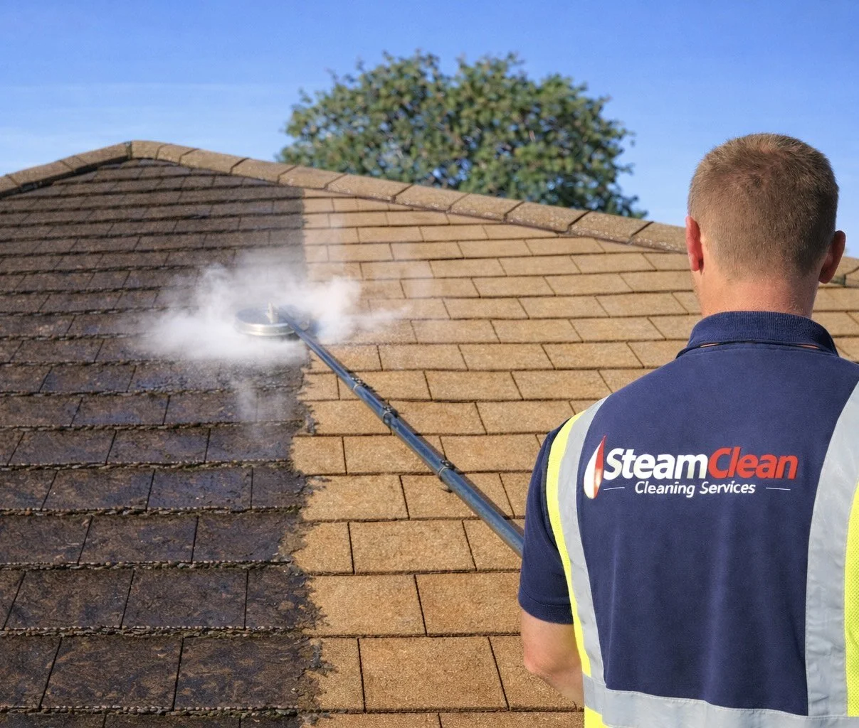 Our steam cleaning method safely removes moss, algae, lichen, and debris from roofs, extending their lifespan without causing damage.